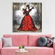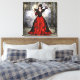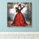 Representación digital en 3D de una hermosa mago hembra con un vestido rojo y negro con alas en un fantástico y espeluznante fondo de castillo