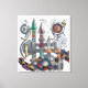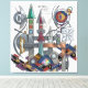 This digital artwork, titled "Astral Pilot," is a complex geometric composition heavily influenced by the constructivist visions of El Lissitzky and his "Prouns." It features a vertical assembly of architectural forms, combining metallic textures, marble surfaces, and vibrant glass elements. Sharp spires and interlocking beams create a sense of structural depth, while floating sickles and circular discs add dynamic movement. The palette balances industrial greys with bold accents of red, blue, and gold. Crystalline clusters and glowing gems are integrated into the towers, suggesting a fusion of technology and mysticism. Runic inscriptions and cryptic symbols are etched onto the surfaces, enhancing the "astral" theme. This piece serves as a modern homage to early 20th-century avant-garde design, perfect for modern interiors, studios, and fans of geometric abstraction.