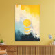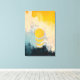 Esta obra de arte abstracta minimalista captura la belleza tranquila de una puesta de sol a través de texturas suaves y una composición moderna refinada. Un círculo dorado cálido flota suavemente sobre formas superpuestas, sugiriendo el sol descendiendo hacia el horizonte. Azules apagados, tonos de carbón profundo y blancos cremosos se mezclan sin problemas debajo, creando un contraste pacífico con el cielo amarillo brillante de arriba.