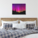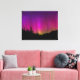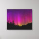 Un hermoso paisaje nocturno. Las montañas y los árboles aparecen como una silueta negra frente a una brillante y vívida exposición de luces nórdicas brillando por encima. Este emocionante cielo nocturno brilla en rosa, morado y amarillo.