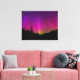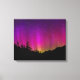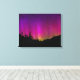 Un hermoso paisaje nocturno. Las montañas y los árboles aparecen como una silueta negra frente a una brillante y vívida exposición de luces nórdicas brillando por encima. Este emocionante cielo nocturno brilla en rosa, morado y amarillo.