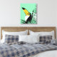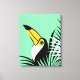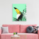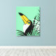 Arte de fauna tropical en color plano de Toco Toucan entre los frontales de palmeras sobre fondo verde azulado claro