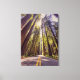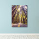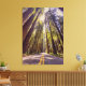 Una sinuosa carretera de asfalto se extiende a través de un denso bosque de altísimos árboles de secuoyas. La luz del sol se filtra a través del dosel forestal, arrojando sombras sobre el camino. Los árboles altos y delgados tienen corteza de color marrón rojizo y vegetación exuberante, lo que crea una sensación de asombro y tranquilidad. La carretera está bordeada de un vibrante y verde subcrecimiento, lo que contribuye a la belleza natural de la escena.