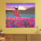 Una bailarina afroamericana de bailarina es representada a mitad de camino sobre un vibrante campo de flores rosadas y violetas, con montañas y un cielo sereno y atardecer al fondo. Lleva un traje de ballet rosado con zapatos a juego, expresándose alegremente a través del movimiento en un entorno natural y pintoresco.