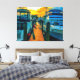 Esta impresión de lienzo muestra una fotografía original de ZoeSPEAK de una puesta de sol sobre el puerto. El camino de madera entre dos barcos está iluminado por el sol, que parece casi tan naranja amarillo como el cielo. Los dos barcos están a la sombra, en tonos blancos azulados, formando una escena apacible con colores complementarios.