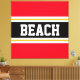 Este diseño deportivo costero presenta texto BEACH en negrita dentro de una amplia franja central horizontal negra con rayas de carreras blancas y amarillas doradas contra rayas de borde exterior rojo brillante. El texto se puede personalizar.