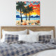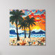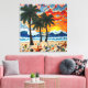 Beach home wall art décor. An impasto oil painting style ai illustration of a beach full of palm trees, sea glass, sea shells and ocean waves at sunset. A bright colorful mesh of colors make this coastal art vibrant and beautiful!