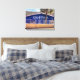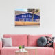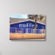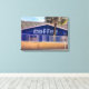 Beba el sueño de CAFÉ más tarde - En letras blancas gastadas sobre un fondo azul cobalto pintado en una pared de ladrillo, el cartel de la fotografía original de ZoeSPEAK en esta tela Print dice todo a los amantes del café. La pequeña tienda, con una palmera delante y un tejado de paja detrás, está tomando el sol por la tarde.