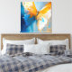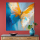 This luminous abstract artwork captures the fragile power of transformation through the image of a butterfly in mid-flight. Warm golden-orange wings spread wide against a serene backdrop of layered blues, soft ivory, and subtle sky tones, creating a feeling of openness, light, and freedom. Expressive brushstrokes and fluid textures give the butterfly a sense of motion, as if it has just emerged and is lifting into the air.