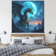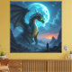 Ein riesiger, leuchtender Drache mit mystischen Runen auf seinen Schuppen erhebt sich vor dem Vollmond. In einer surrealen, außerweltlichen Landschaft steht ein einzelner Wanderer dem uralten Wesen gegenüber. Eine Szene zwischen Ehrfurcht, Magie und kosmischem Geheimnis.