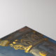 A black panther themed wall art. On the front is an illustration of a majestic black panther with fur like molten black and gold, laying on a cliff ledge bathed in ethereal moonlight. Intricate carvings adorn crumbling stone pillars, and bioluminescent flora casts a soft, otherworldly glow. The scene is rendered in a rich, textural oil painting style with thick, .