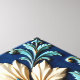 A square tile with a symmetrical floral design in shades of blue, white, and gold, ornate details, intricate patterns, elegant, royal blue background.