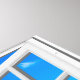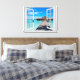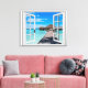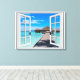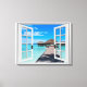 La escena oceánica Trompe L'oeil Picture con vistas a la falsa ventana del paseo marítimo. Efecto especial de la ilusión óptica fotográfica, con ventana abierta y hermosas vistas al mar tropical.