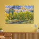 La imagen muestra un paisaje con álamos en colores otoñales. Los árboles son predominantemente amarillos y verdes, y algunos muestran la transición a tonos caídos. Un pequeño río fluye en primer plano, bordeado de arbustos. Al fondo, se ve una colina rocosa, con más árboles que representan follaje otoñal. El ambiente general es tranquilo y sereno, lo que refleja la belleza de la temporada de otoño.
