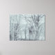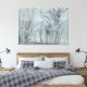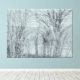 La imagen muestra una vista monocromática de un bosque en invierno. Los árboles están desnudos, sus ramas llegan hasta el cielo. La escena tiene un efecto borroso, que sugiere movimiento o una calidad de ensueño. El conjunto es tranquilo y los tonos grises y blancos dominan el paisaje. En el fondo, se puede ver un trelio distante, añadiendo profundidad a la composición.