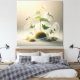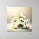 Eine skulpturale botanische Szene mit gezackten grünen Blättern, die aus weichen Moosformen emporwachsen, begleitet von glatten Kugelobjekten und feinem Nebel. Der minimalistische Hintergrund und das warme Licht erzeugen eine ruhige, zeitgemäße Atmosphäre, die natürliche Schönheit mit architektonischer Klarheit verbindet – ideal für moderne Wohnräume, Studios und galerieartige Innenbereiche.