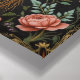 An ornate tree with roots and flowers on a black background, surrounded by a decorative gold frame, symmetrical composition, detailed botanical illustration, vintage style.
