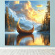 Un bote dorado ornamentado flotando con gracia en un tranquilo lago rodeado de árboles y con vistas a un vibrante y soñador cielo de amanecer lleno de nubes doradas.