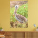 En una de las primeras imágenes aparece un pelícano marrón de California en medio de una vegetación exuberante. El plumaje del pelícano es una mezcla de marrón y gris, con un característico pico largo que tiene un toque de naranja en la punta. Su cabeza está salpicada de blanco y tiene un ojo oscuro. El fondo es un suave soplo de follaje verde y un toque rosa de una flor distante que crea un ambiente natural y sereno.