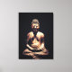 La imagen muestra una estatua de Buda en bronce, sentada en una pose meditativa con las manos descansando en su regazo. La estatua está tallada con detalles intrincados, incluyendo una expresión serena en la cara y túnicas que fluyen. El Buda está decorado con un fondo oscuro, casi negro, que resalta el color marrón dorado de la estatua.