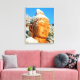 La cabeza de un Buda de madera tallada cubierto de nieve fresca