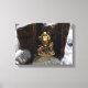 Una hermosa imagen de lona de un Buda feliz dorado protegida por una roca mientras el océano se estrellaba a su alrededor.