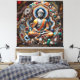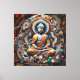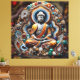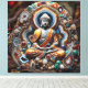 La imagen muestra una estatua de Buda intrincadamente diseñada con una variedad de geológicos y piedras preciosas. El Buda se representa en una pose meditativa, con las manos en el regazo y las piernas cruzadas. La estatua está adornada con rocas vibrantes y multicolores, como rebanadas agatas, geodésicos y otros minerales, creando un entorno visualmente impresionante y elaborado.