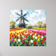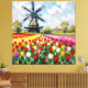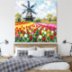 Dieses lebendige Gemälde zeigt eine traditionelle Windmühle, umgeben von einem bunten Feld voller blühender Tulpen in Rot, Weiß, Gelb und Blau. Ein geschwungener Pfad führt durch die farbenfrohe Landschaft unter einem strahlend blauen Himmel mit leichten Wolken – ein idyllisches Frühlingsmotiv voller Leben und Freude.