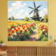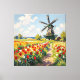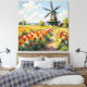 Dieses lebendige Gemälde zeigt eine traditionelle Windmühle, umgeben von einem bunten Feld voller blühender Tulpen in Rot, Weiß, Gelb und Blau. Ein geschwungener Pfad führt durch die farbenfrohe Landschaft unter einem strahlend blauen Himmel mit leichten Wolken – ein idyllisches Frühlingsmotiv voller Leben und Freude.