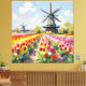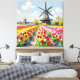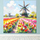 Dieses lebendige Gemälde zeigt eine traditionelle Windmühle, umgeben von einem bunten Feld voller blühender Tulpen in Rot, Weiß, Gelb und Blau. Ein geschwungener Pfad führt durch die farbenfrohe Landschaft unter einem strahlend blauen Himmel mit leichten Wolken – ein idyllisches Frühlingsmotiv voller Leben und Freude.