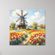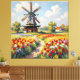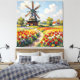 Dieses lebendige Gemälde zeigt eine traditionelle Windmühle, umgeben von einem bunten Feld voller blühender Tulpen in Rot, Weiß, Gelb und Blau. Ein geschwungener Pfad führt durch die farbenfrohe Landschaft unter einem strahlend blauen Himmel mit leichten Wolken – ein idyllisches Frühlingsmotiv voller Leben und Freude.