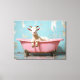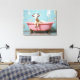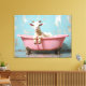 Un cuadro pintoresco con una cabra blanca con cuernos relajante en una bañera rosa vintage, colocada contra una pared azul claro para una agradable y divertida escena rústica.