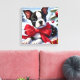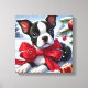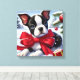 Un adorable cachorro del Boston Terrier con un arco rojo bajo la nevada junto a decoraciones navideñas