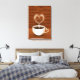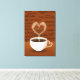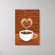 Una taza de ilustracion de café con una taza blanca de café caliente con humo en forma de corazón sobre un fondo marrón con tipografía en la pared.