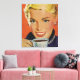 Imagen de Ilustracion vintage de bebidas y bebidas con una mujer feliz sonriendo y bebiendo su taza de café matutina. ¡Clásico kitsch retro de los años 50!