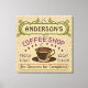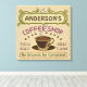 La decoración de esta pared de tela envuelta con temática de café es perfecta para los que dirigen su propia cafetería o tienen una temática de café en la cocina de su casa. Hecho en tonos retro marrón, verde, morado y con toques de naranja, este diseño inspirado en el espresso/capuchino presenta una taza sobre un platillo, dos carteles de texto personalizados y las palabras "Cafetería / asado fresco / gran sabor" en morado. La taza está humeante y la pancarta superior tiene movimientos que imitan el humo. Todo descansa sobre un fondo beige claro de café frijol. Utilice las plantillas para agregar fácilmente su nombre. También puede cambiar el lema final si lo desea, que actualmente dice "Sin motivos para la queja". Si necesita cambiar el tamaño del texto para ajustarlo, haga clic en "Personalizar". Si decide seleccionar una forma de lienzo que no sea cuadrada, también puede seleccionar elementos de diseño bajo "Personalizar" y redimensionarlos para que se ajusten mejor a su forma de lienzo. Tome una taza de Joe y admire su propio arte de café personalizado.