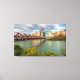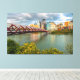 La imagen muestra el Puente de la Paz en Calgary, Alberta, Canadá, con el horizonte de la ciudad como fondo. El puente, con su distintivo diseño rojo y vidrio, se extiende a lo largo de un río que refleja el cielo. Las flores amarillas florecen en primer plano, añadiendo un toque de color. El paisaje urbano está formado por edificios modernos con fachadas de cristal que reflejan la luz del sol.
