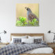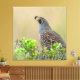 A California Quail se erige orgullosamente en medio del follaje verde. El pájaro tiene una cabeza gris con marcas negras y blancas, un cuerpo marrón con ramas blancas y una columna distintiva curva negra sobre su cabeza. El fondo es un beige suave y borroso, lo que sugiere un entorno natural en el exterior. El codorniz es el foco principal, capturado en una toma de video que destaca su detallado plumaje y su elegante postura.