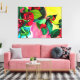 De una pintura acuarela original de flores camellias rojas con follaje verde del artista Sacha Grossel. Estas flores son coloridas, vibrantes y brillantes y este arte floral colorido diseño botánico se vería hermoso en cualquier entorno. PInk y fondo vibrante amarillo.