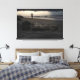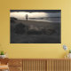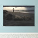 Una hermosa fotografía en blanco y negro de un joven caminando a lo largo de la costa de Flagler Beach en la costa este de Florida con grandes rocas en primer plano y una oscura nube de tormenta en el fondo. Esta foto temática de la playa sobre lienzo sería una maravillosa pieza de conversación colgada en tu casa u oficina.