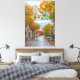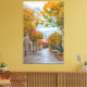 Vista de la calle en la Universidad de Stanford en otoño. El camino está húmedo, reflejando el cielo y los árboles circundantes. Los árboles bordean ambos lados de la calle, mostrando colores vivos de otoño de amarillo, naranja y rojo. A lo lejos, se ve la Torre Hoover, de techo rojo. El cielo está nublado, creando una luz suave y difusa.