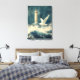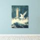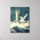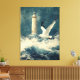 Canvas wall art with nautical design of a seagull, lighthouse and crashing waves.