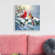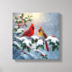 Un par de cardenales rojos norteños se posan en una rama sagrada cubierta de bayas rojas y nieve.