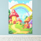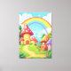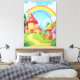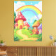 Casas de setas con gorras rojos, marrones y azules con manchas blancas. Un cielo azul con arcoiris. Bonito toque en la pared de un dormitorio para niños.