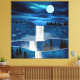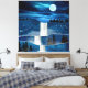 Escena paisajística abstracta de una cascada de agua con luna, pájaros, cielo nocturno y estrellas.