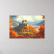 Este cuadro muestra un gran castillo medieval encaramado en lo alto de una colina, rodeado por un impresionante paisaje otoñal. Las torres y las murallas fortificadas del castillo se elevan sobre un bosque de vibrantes follaje naranja, rojo y oro. Como telón de fondo, unas montañas onduladas y un sereno lago se extienden hasta el horizonte, bañados por una suave luz dorada. Las avispas de niebla sobrevuelan los valles, añadiendo una cualidad mística a la escena. Los tonos cálidos de otoño contrastan con la piedra fresca del castillo, creando un ambiente impresionante y majestuoso.