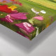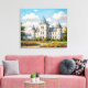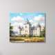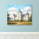 A representation on canvas in the impressionist pictorial style of a castle with a garden during the day.