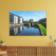 Una fotografía brillante y de alta resolución que captura el moderno desarrollo del paseo marítimo a lo largo de la navegación Calder & Hebble en Wakefield. La imagen muestra un gran complejo de apartamentos revestido de madera y blanco con balcones de vidrio, perfectamente reflejado en el agua tranquila del canal. En el plano medio, son visibles las estructuras de piedra de Fall Ings Lock y un puente peatonal, situados sobre un fondo de viviendas de ladrillo rojo y un cielo despejado. Esta perspectiva enfatiza la exitosa renovación urbana de los históricos muelles de Wakefield.