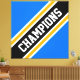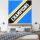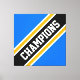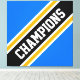Este diseño deportivo presenta texto de los CAMPEONES atléticos dentro de una banda de carreras ancha en diagonal en blanco, negro y amarillo dorado contra amplias franjas exteriores azules brillantes. El texto de este diseño se puede personalizar.