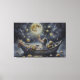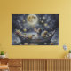 Una escena caprichosa se desarrolla cuando una joven en un vestido a rayas se sienta en un bote adornado con flores, extendiendo la mano hacia una luna brillante suspendida en un cielo nocturno lleno de estrellas. A su lado, un osito de peluche agrega un encanto nostálgico, mientras que estrellas doradas flotan como luciérnagas alrededor de ellos. El agua debajo refleja suaves ondulaciones, flores de loto dispersas y una luz etérea, realzando la calidad onírica del momento. Toda la composición está bañada en azules suaves, pasteles suaves y dorados luminosos, evocando sentimientos de asombro, inocencia e imaginación tranquila. Este diseño de fantasía mágica es perfecto para crear una atmósfera tranquila en el espacio de un niño, guardería o rincón de lectura. Habla al espíritu de la curiosidad y la belleza de los sueños, representado en un estilo pictórico inspirado en los libros de cuentos que combina el realismo con la